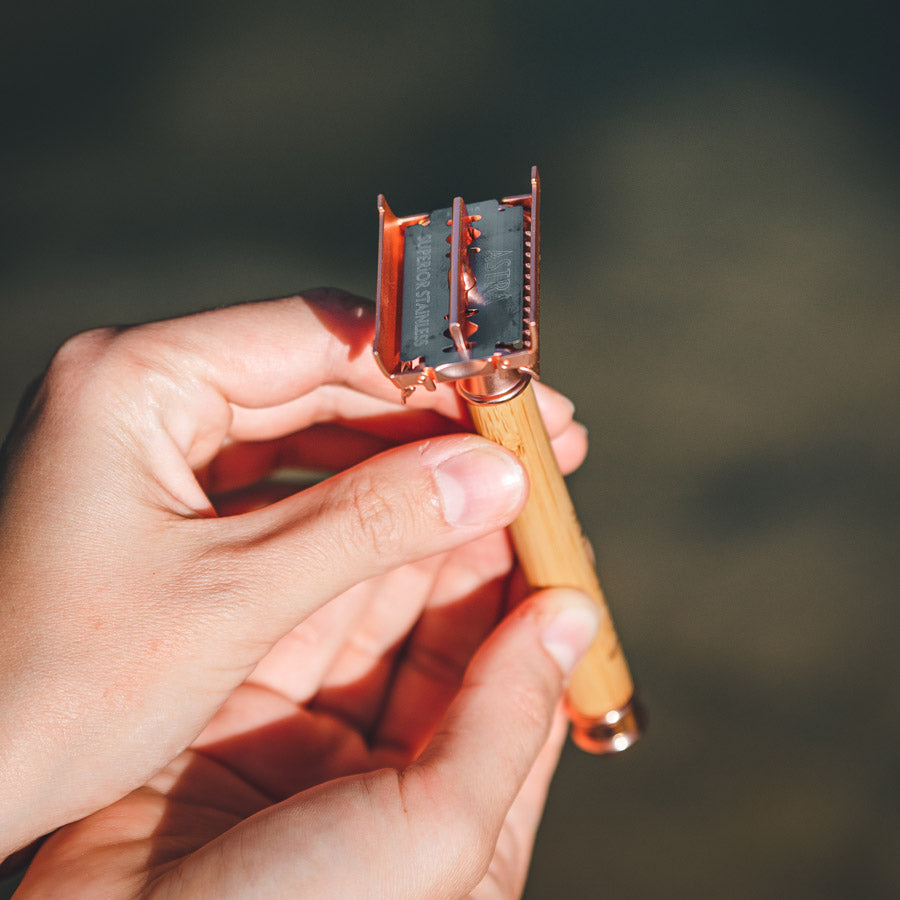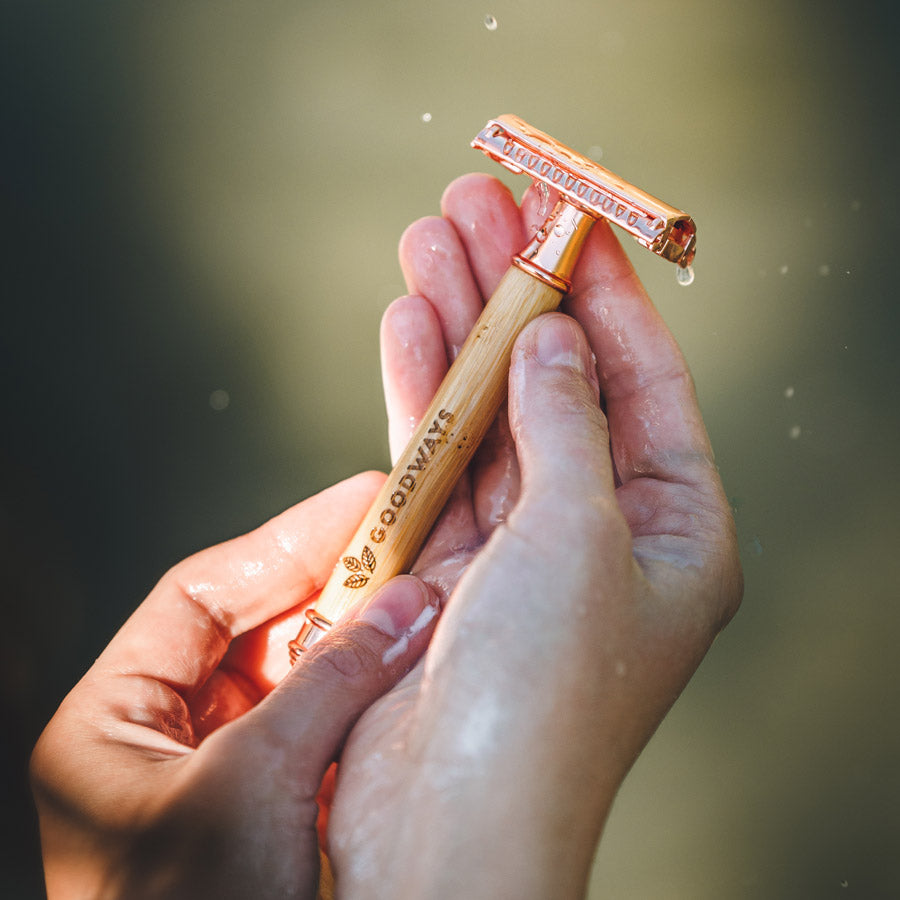 Jedno holítko na celý život? Proč ne! Vraťme se ke klasickému holení bez plastu. GoodRazor je znovupoužitelný holicí strojek na žiletky se stojánkem vyrobený z přírodního bambusu, kvalitní mosazi a zemaku (slitiny zinku). Je stylovým doplňkem do každé koupelny či kosmetické taštičky. Ve dvou provedeních, elegantní světlý Rose Gold se hodí pro dámy a robustní Dark pro pány. Holení s GoodRazorem je šetrné k pokožce, bezpečné a hodí se na všechny části těla.