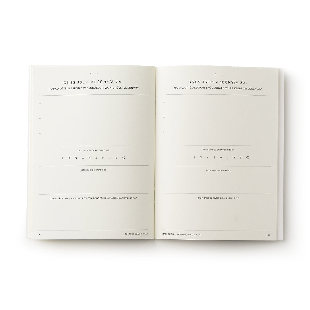 Občas se může stát, že se v životě necháme strhnout proudem nepříjemných situací a okolních vlivů, které nás doslova pohltí, což může mít pro nás i naše blízké dlouhodobé negativní důsledky. Tento deník ti poskytne prostor k zamyšlení se nad věcmi, za které jsi vděčný/á, a k nalezení hojnosti ve tvém každodenním životě.