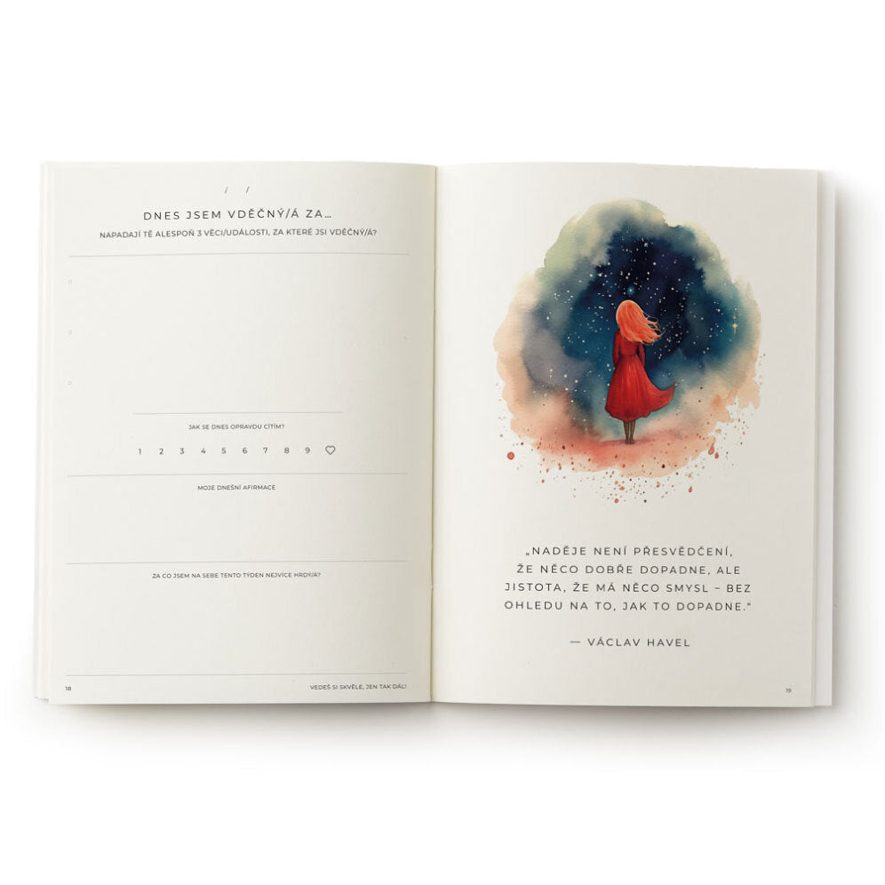 Krásný design Jemné odstíny barev a krásné ilustrace, které tě vtáhnou do světa myšlenek a vysoce kvalitní udržitelný papír, kterého je radost se dotýkat.