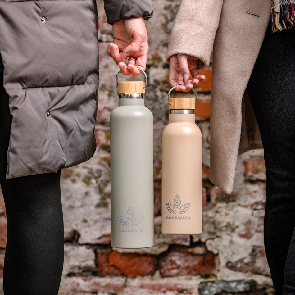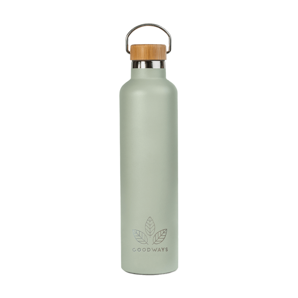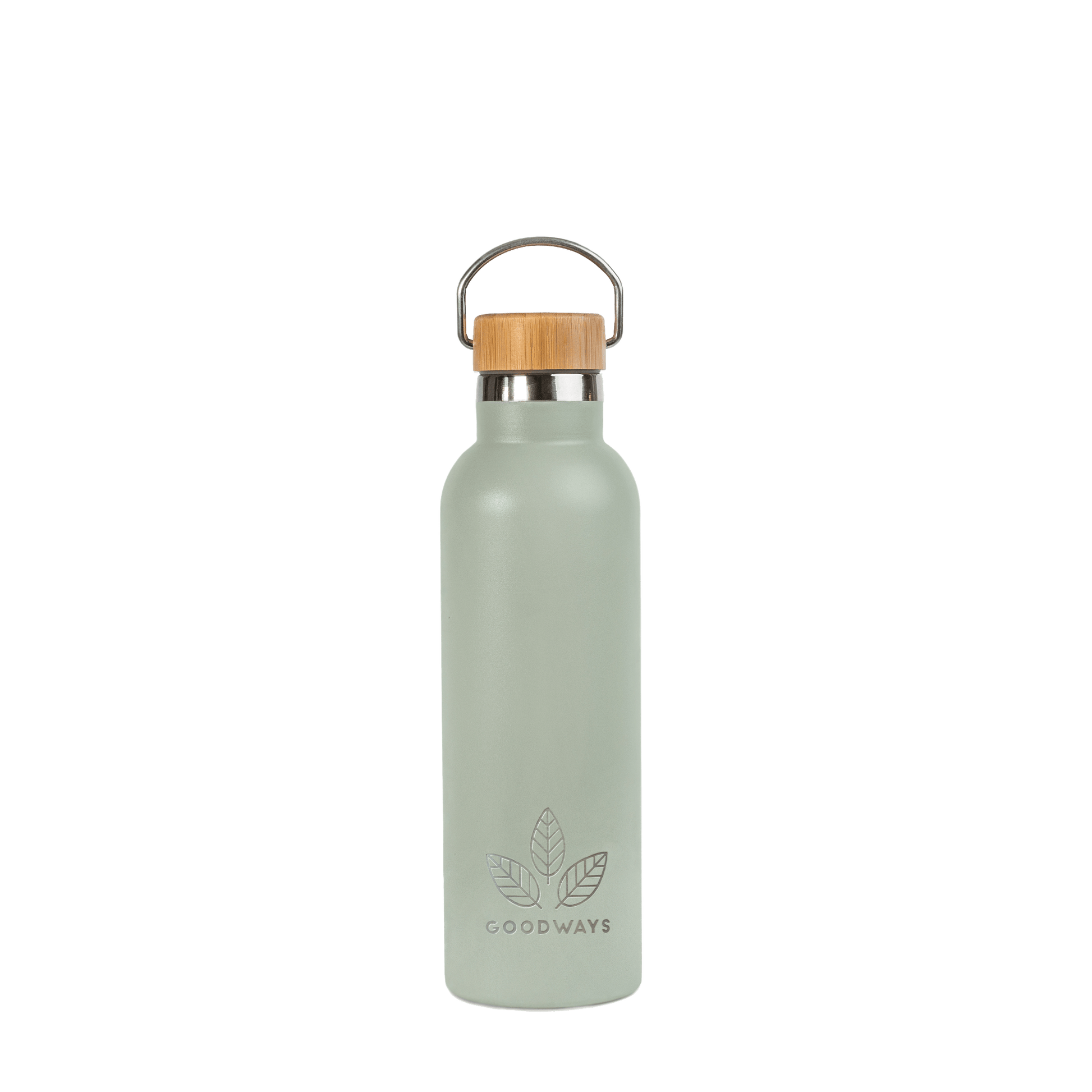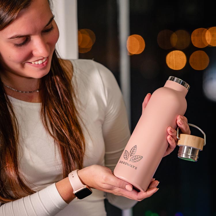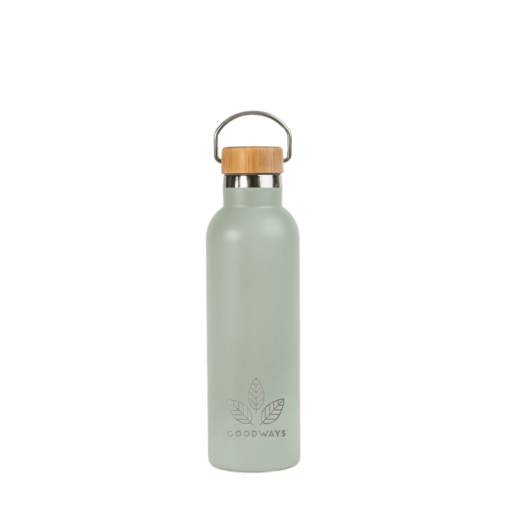 The GoodFlask bottle consists of a double-walled stainless steel bottle with a bamboo lid and metal strap. The double-walled vacuum insulation keeps your drinks hot or cold all day long, even in extreme temperatures!