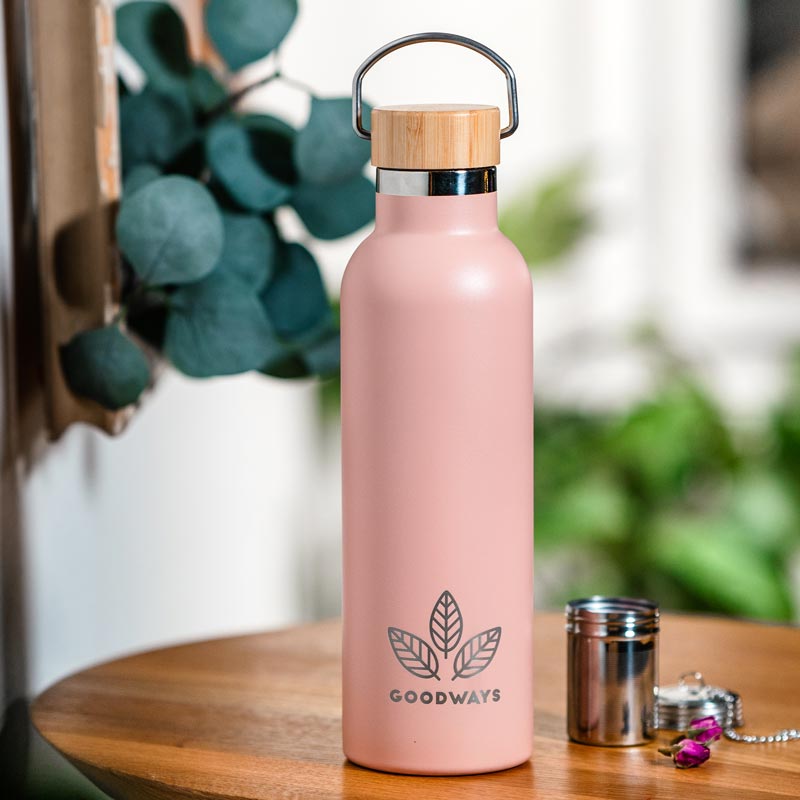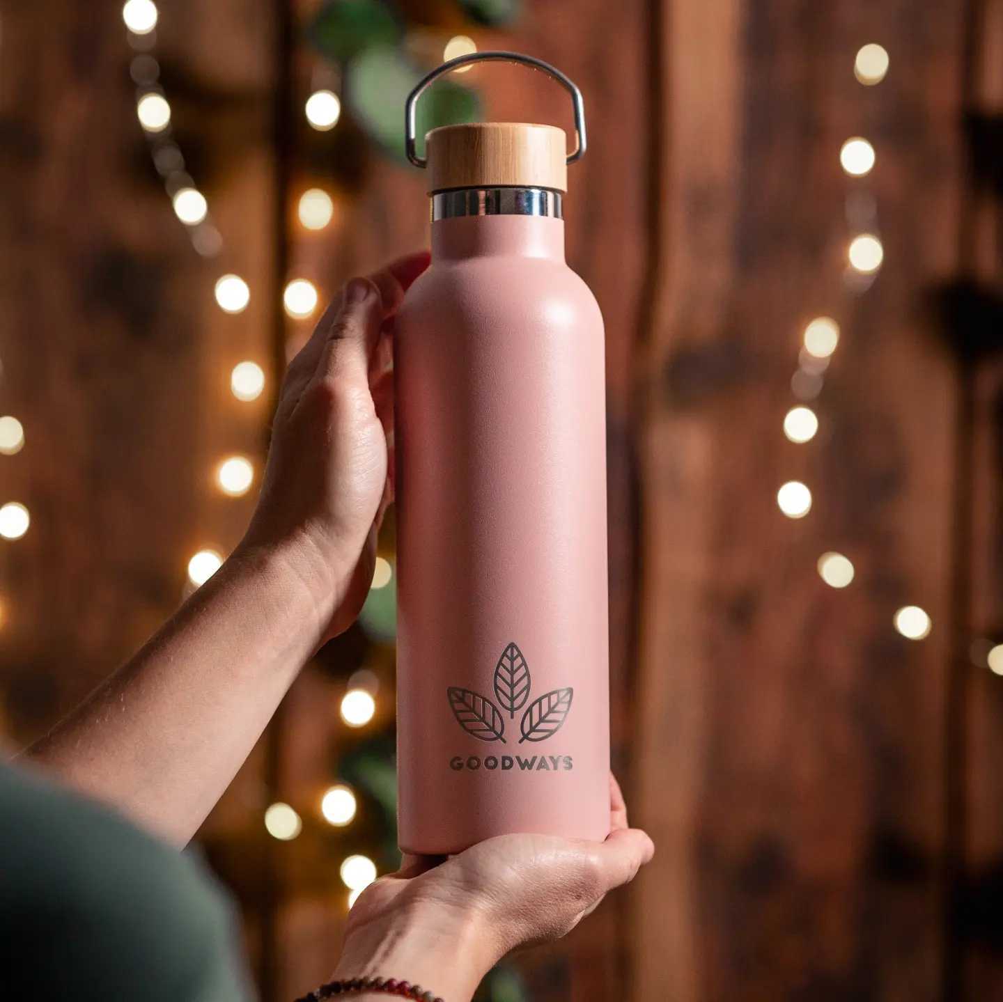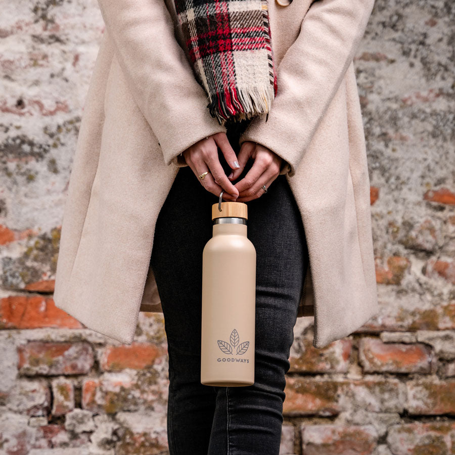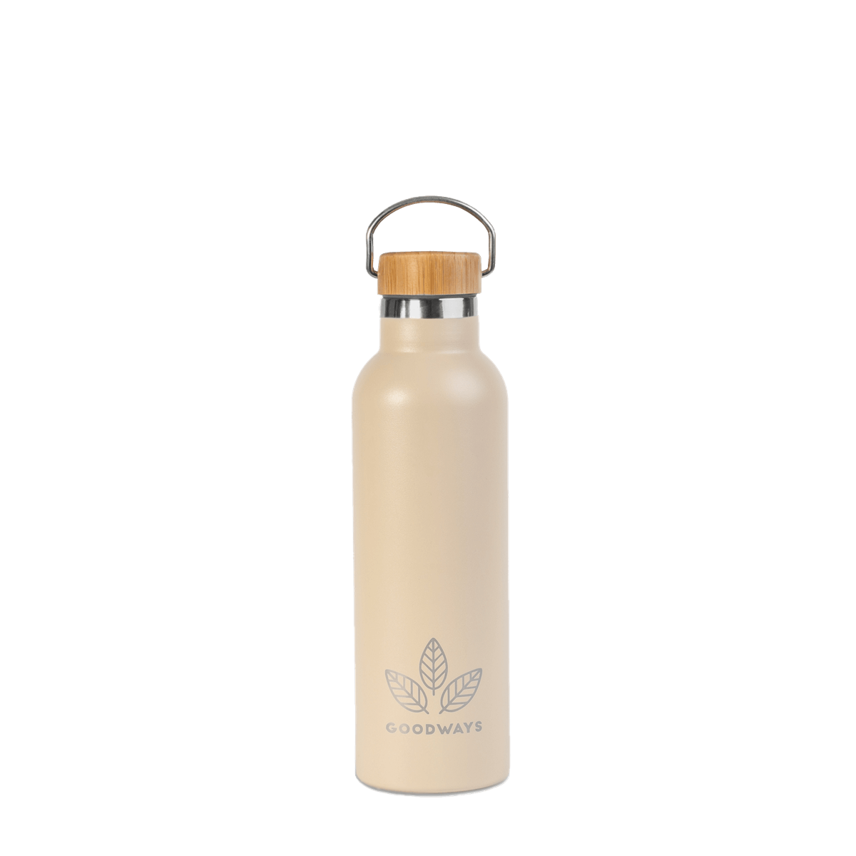 The GoodFlask bottle consists of a double-walled stainless steel bottle with a bamboo lid and metal strap. The double-walled vacuum insulation keeps your drinks hot or cold all day long, even in extreme temperatures!